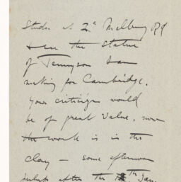 | Description | One letter from English sculptor Hamo Thornycroft to Helen Allingham, sending Helen two tickets and inviting her to visit his studio in Kensington should she be in town during the next few weeks. Thornycroft invites Helen to view the statue of Tennyson he is working on. He asks she visit on an afternoon after the 12th of January, except for Saturday and Monday afternoons. |