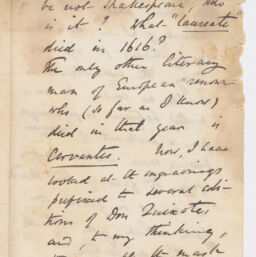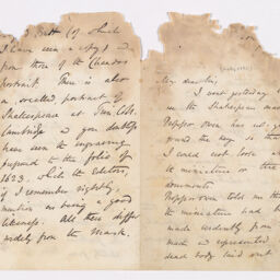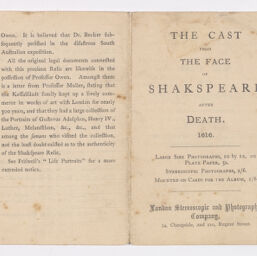 | Description | One letter from English classical and Shakespearean scholar William George Clark to William Allingham with accompanying page from a book of Shakespeare, page titled "The Cast from The Face of Shakespeare After Death, 1616," describing the finding of the death-mask of Shakespeare by a Dr. Becker, and then studied by Professor Owen from Cambridge. In the letter, Clark tells Allingham he said gone to see the mask, and discusses the miniature as described by Owen. Clark also shares the history of the mask in Cologne. Clark shares that he has strong doubts as the details of the mask differ from the Chandos portrait. He also theorizes that if the mask is not of Shakespeare, the only other "laureate" that died in 1616 was Cervantes, and the mask could share similarities with an engraving in a specific edition of Don Quixote. Clark also shares his address for the coming month at Trinity College in Cambridge. |