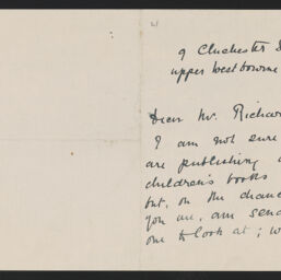 | Description | One letter from Jean C. Archer to Grant Richards about sending Richards a children's book manuscript for him to consider publishing by her and J. H. Irvine. |