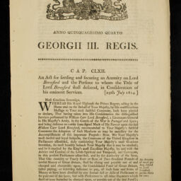 | Title | Anno quinquagesimo quarto Georgii III Regis. Cap. CLXII, An act for settling and securing an annuity on Lord Beresford and the persons to whom the title of Lord Beresford shall descend, in consideration of his eminent services (29th July 1814) |