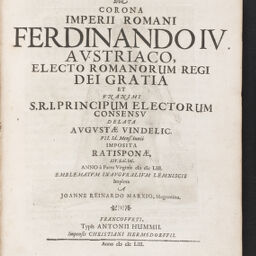 | Title | Doron basilikon, sive, Corona Imperii Romani Ferdinando IV Austriaco, electo Romanorum Regi Dei gratia :bet unanimi S.R.I. principum electorum consensu delata Augustae Vindelic. VII Id. mens. Iunii, imposita Ratisponae, XIV kal. Iul. anno à Partu Virginis MDCLIII emblematum inauguralium lemniscis implexa / a Joanne Reinardo Marxio, Moguntino |