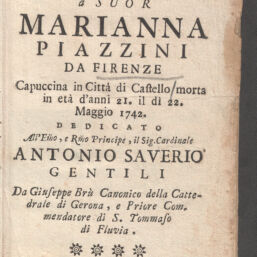 | Title | Breve ragguaglio di alcune virtù singolari, e doni speciali di Dio conceduti a suor Marianna Piazzini da Firenze capuccina in Città di Castello morta in età d'anni 21. il dì 22. maggio 1742 |